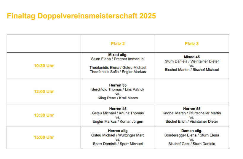 als krönenden Abschluss unserer diesjährigen Doppel-Vereinsmeisterschaft laden wir euch herzlich zum Finaltag diesen Samstag, den 13. September , ein.